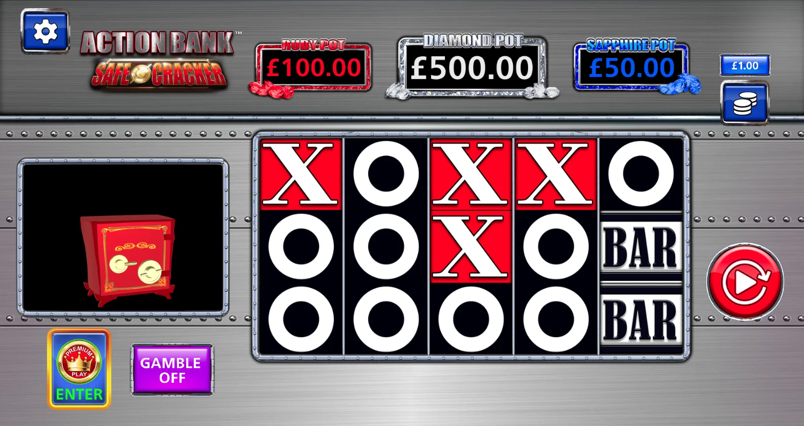 The symbols in Action Bank Safe Cracker are very simple, with them being represented by an X, an O and BAR. Alongside these commonly seen slot symbols is a Joker, which represents the game's Wild and features bonus mechanics in play.