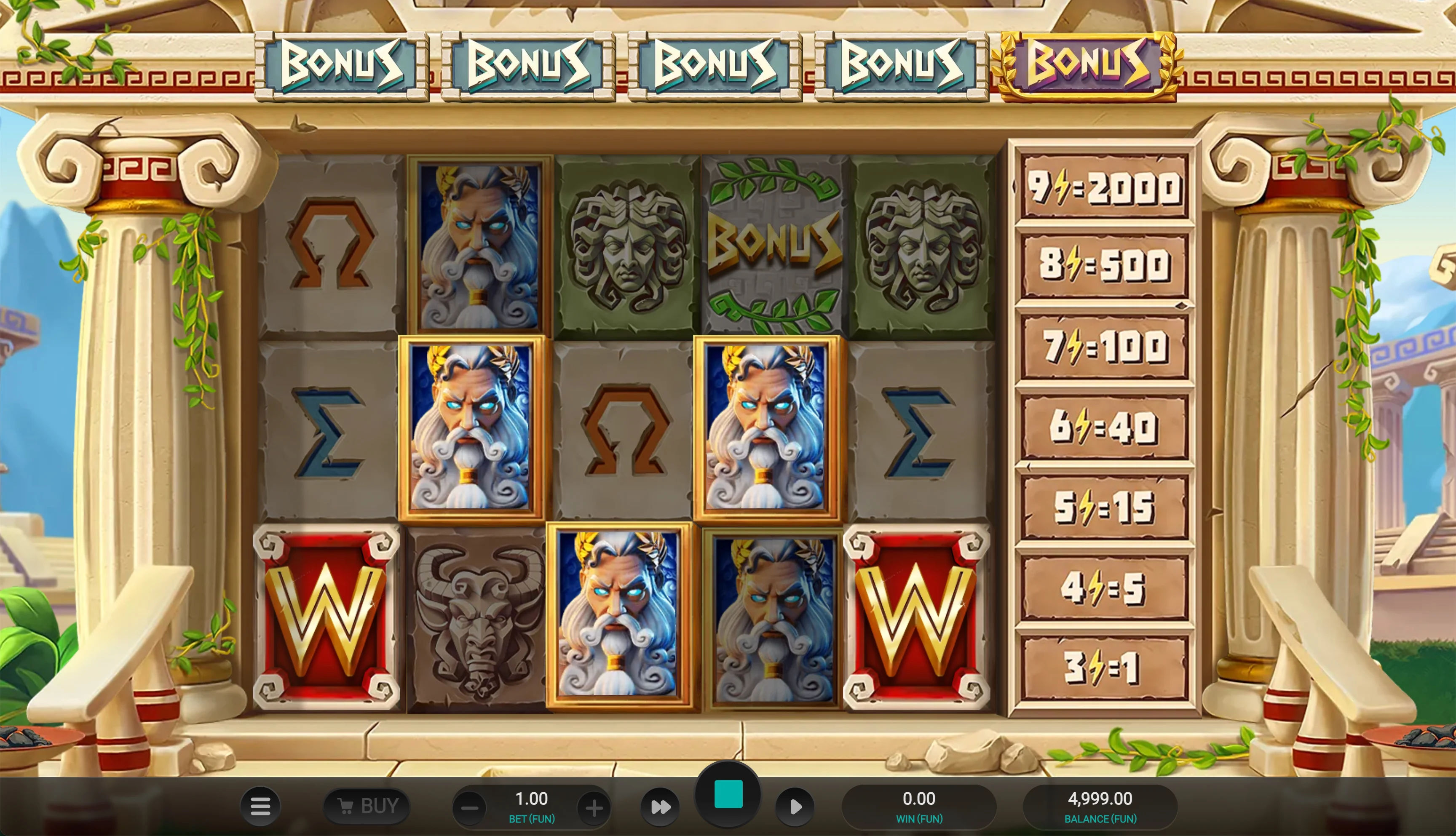 Instead of using any card-related imagery, the lower-valued symbols in the Titan Strike slot are letters from the Greek alphabet that have been carved into stone slabs. A series of stone statues depicting various mythical creatures completes the pay table, serving as the higher-valued symbols.